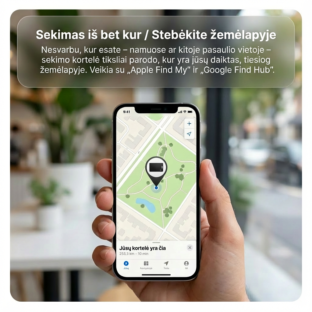 visada žinokite, kur yra jūsų piniginė. Veikia su „Apple Find My“ / „Google Find Hub“.