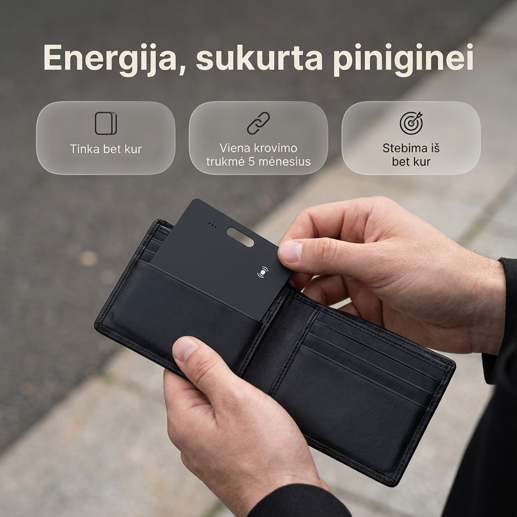 visada žinokite, kur yra jūsų piniginė. Veikia su „Apple Find My“ / „Google Find Hub“.